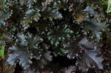 У гейхеры Блэк Таффета крупные глянцевые, почти черные кучерявые листья. Цветки розовые и розово-белые. Цветет в июле в течение месяца.